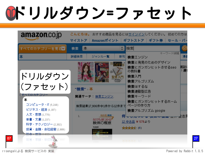 amazon.co.jpなどで絞り込める条件がリンクになっているインターフェイスを見たことがないでしょうか。あれがドリルダウン(ファセット)です。