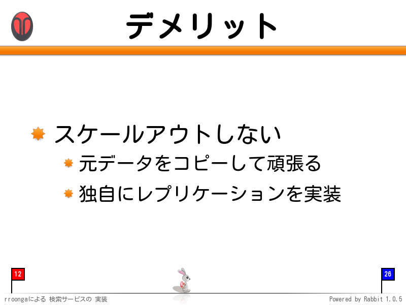 rroongaを使った検索システムの構成とその構成ならではのメリットとデメリットを紹介しました。メリットはメタデータの抽出などgroongaの低レベルのAPIも利用しながら検索システムを構築できることです。デメリットは標準的なレプリケーションの仕組みがないため冗長化やスケールアウトの仕組みを自作する必要があることです。
