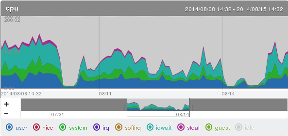 CPU使用率がほぼ0%になっているときはるりまサーチが落ちている状態です。動いているときはCPU使用率50%から100%くらいの状態がほとんどで、そのうちの半分いかないくらいがiowaitです。ロードアベレージは1から5の間なので、常に数プロセス待っている状態です。