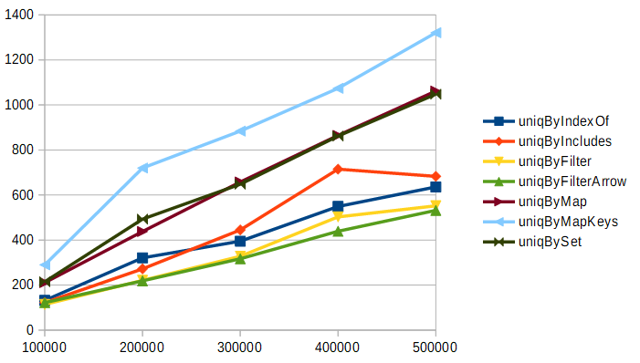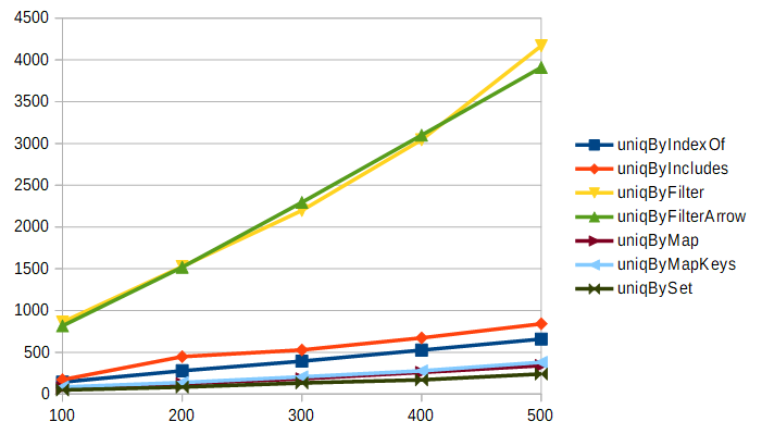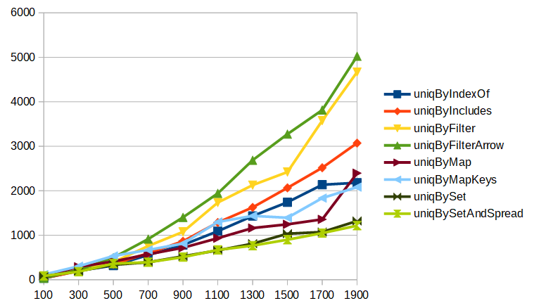 グラフの傾向を見ると、計算量が大きいアルゴリズムであるindexOfやincludesを使った物はいずれも指数関数的な増大を見せています。1つ前の結果でuniqByIndexOfやuniqByIncludesが線形の増加に見えたのは、