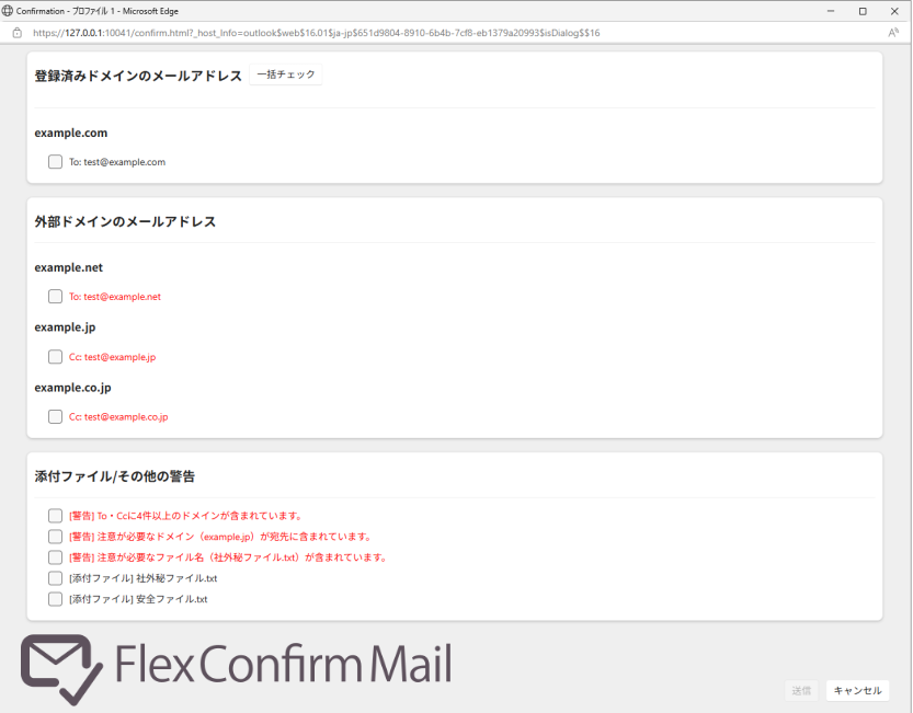 To/Cc/Bcc、添付ファイルなど、重要項目を検出し送信前に確認画面を表示。ミスに気付きやすくなります。